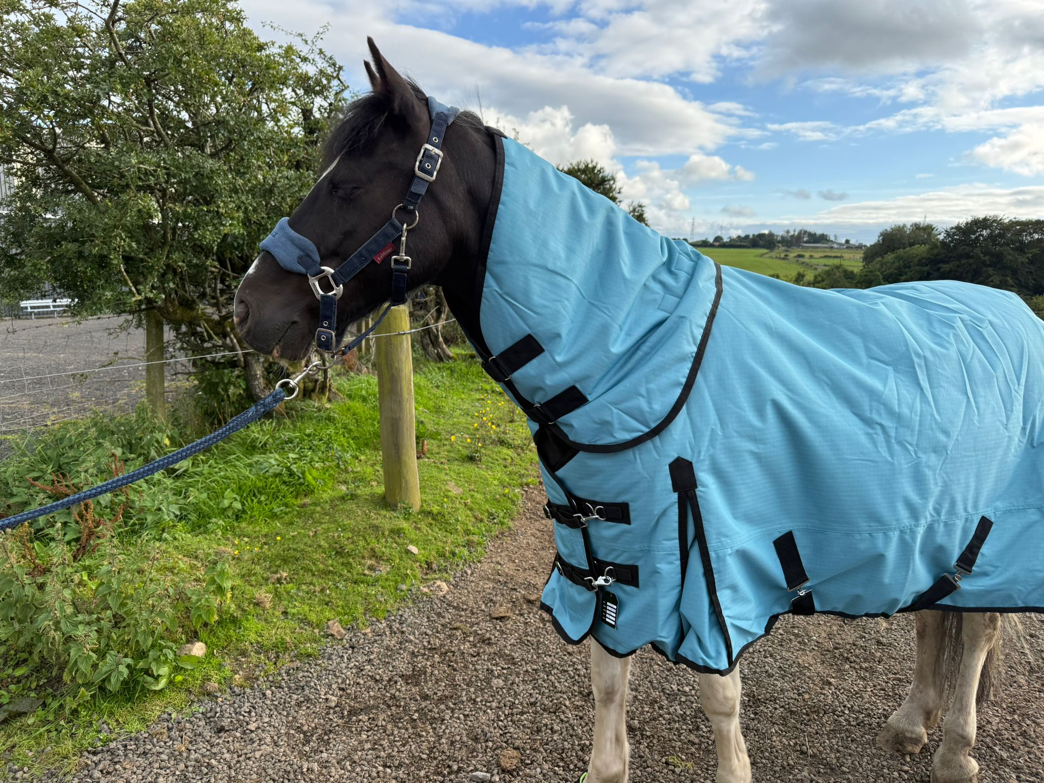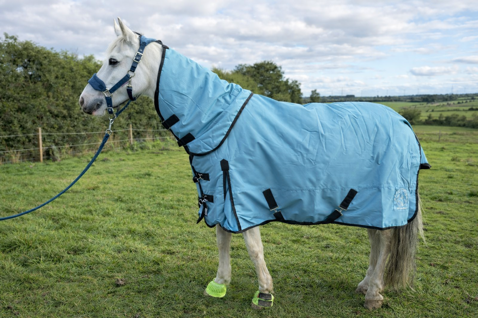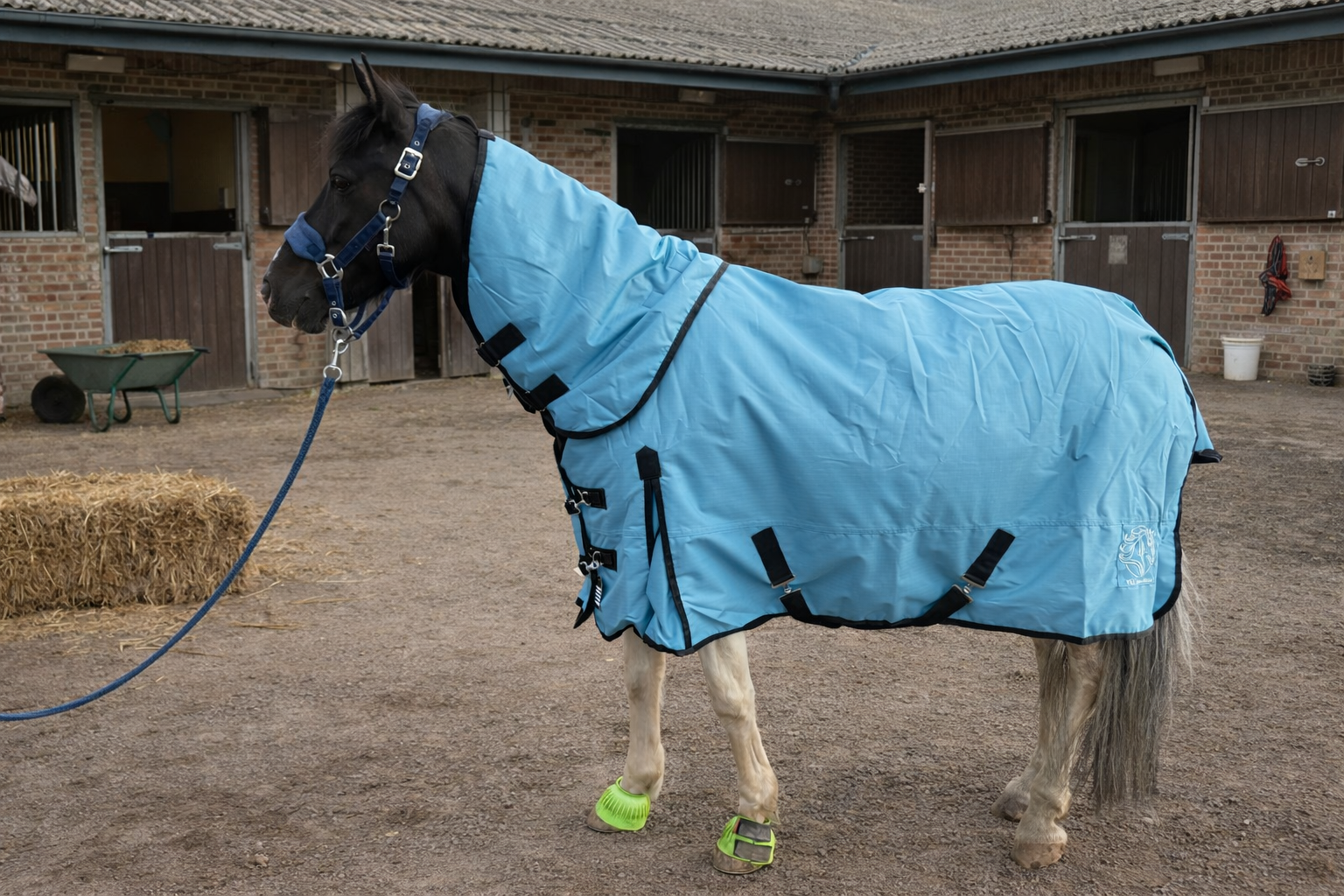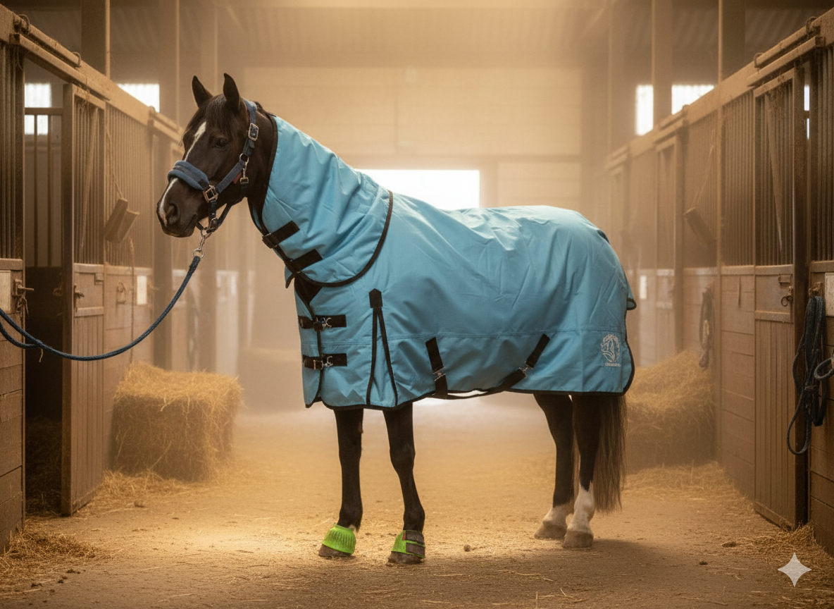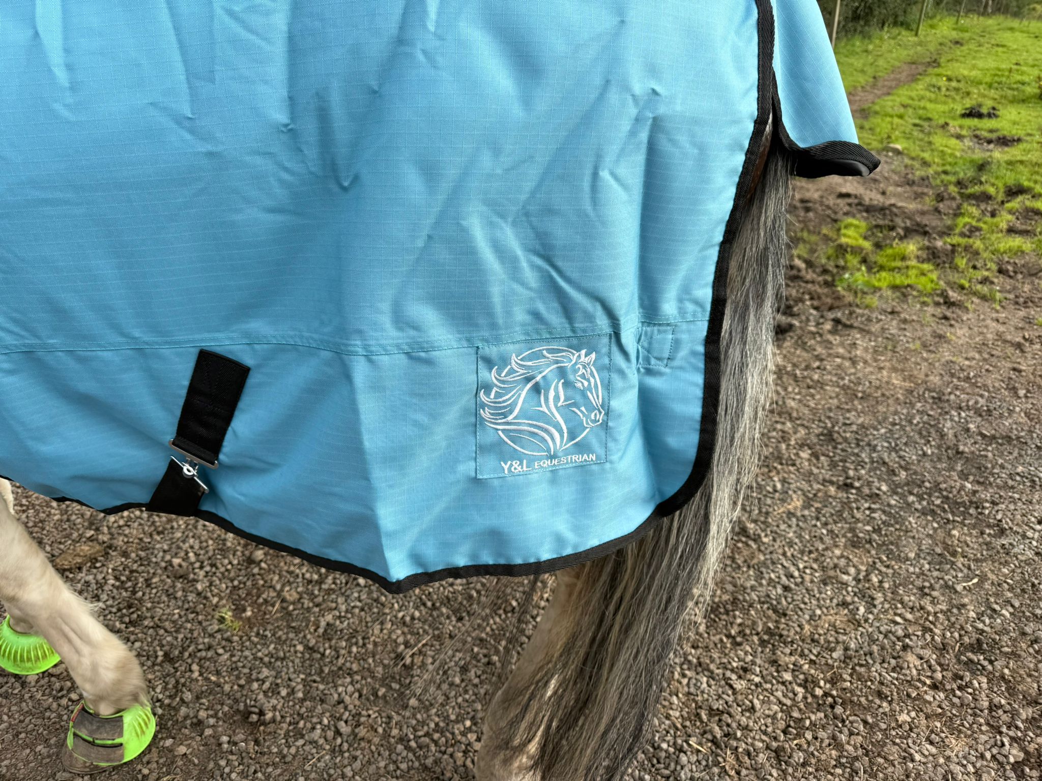 The Y&L Waterproof Horse Turnout Rug (200gm) with detachable neck cover is a high-quality equestrian product designed to keep horses warm and dry during outdoor activities. This teal-coloured turnout rug with black piping finish, easy adjustable buckle chest straps and tail flap offers excellent waterproof protection, making it ideal for use in wet and cold weather condition. This rug provides a comfortable and snug fit for horses, ensuring they stay cosy and protected from the elements. Perfect for horse owners looking for reliable and durable horse wear to keep their equine companions comfortable and snug.